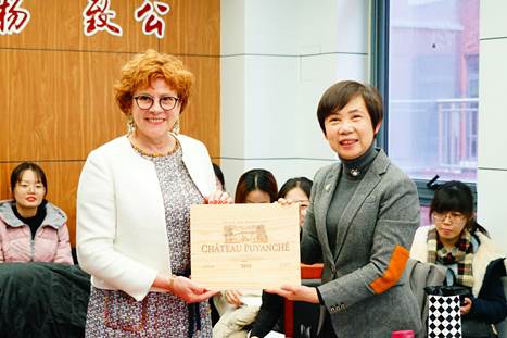 法商特色和国际商务专业发展和学科建设等情况,特别介绍了国际商务专硕着力打造的高端品牌专业,而法国红酒是高端品牌的一部分,红酒与金融、法国跨文化管理都是国际商务未来加强学生指导和学术研究的领域。随后,宏结教授向Arbo女士赠送了中国政法大学纪念徽章,Arbo女士回赠了家族品牌的Logo。