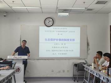 2024年5月30日下午,经济学党支部、2022级2023级学硕党支部在学院路校区图书综合楼507教室,联合开展“中央精神跟进学”主题活动第一讲。本次活动由经济学党支部书记黄立君老师主持,经济学党支部组织委员熊柴老师主讲,以“生态保护补偿的制度安排”为主题,旨在深入学习中央精神,加强党员师生和入党积极分子对国家出台的政策法规的理解认识。