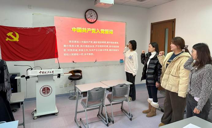 杨思敏同志宣读参加入党宣誓的预备党员名单,包括王宇越、王鸿隽、卢婷婷三位同志。全体预备党员在林申琦同志的带领下紧握右拳,面对鲜艳的党旗庄严宣誓。