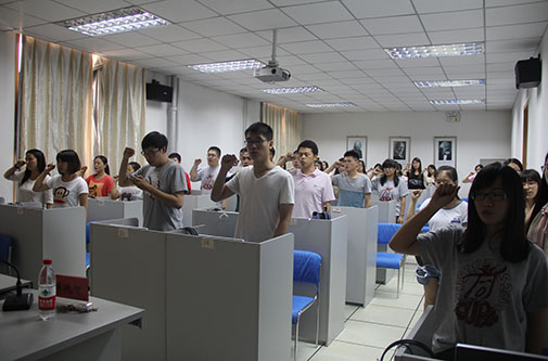 党课最后,全体毕业生党员面向党旗,举起右手,重温了庄严的入党誓词。荡漾在铿锵有力的誓言中的,是学生党员对祖国的忠诚和热爱,也是学生党员对为共产主义事业而奋斗的承诺和担当。