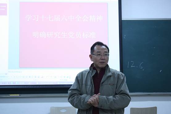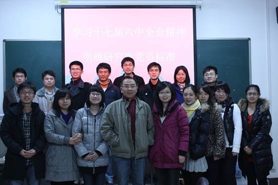 2010级研究生党支部于2011年12月6日晚在教学楼216教室开展题为“学习十七届六中全会精神,明确研究生党员标准”的理论学习研讨会。