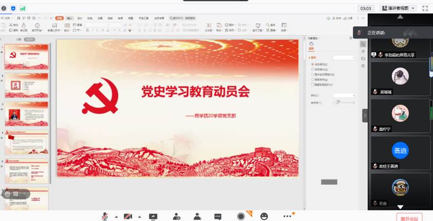 20级学硕党支部于2月27日下午4点在腾讯会议上开展了线上“党史学习教育动员会”的主题党日活动。参加本次活动的有20级学硕党支部党员8人,积极分子以及递交入党申请书同学,共计31人。