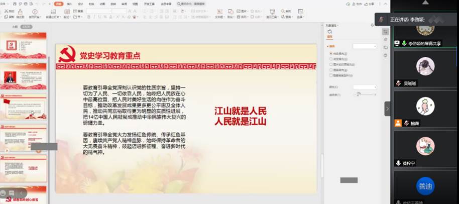 首先,为深入贯彻习近平总书记重要讲话精神,党支部书记李劲颖同学组织同学们学习了开展党史学习教育的重点及重大意义。开展党史学习教育重点要教育引导全党深刻认识党的性质宗旨,坚持一切为了人民、一切依靠人民;重点要教育引导全党大力发扬红色传统、传承红色基因;重点要教育引导全党胸怀中华民族伟大复兴战略全局和世界百年未有之大变局;重点要教育引导全党深化对中国化马克思主义既一脉相承又与时俱进的理论品质的认识。