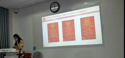 首先,为深入贯彻习近平总书记重要讲话精神,党支部书记李劲颖同学组织同学们学习回顾习近平总书记在庆祝中国共产党成立100周年大会上的重要讲话。百年来,我们党坚持“走自己的路”,走出了具有鲜明民族特色和时代特征的“救国之路”、“建国之路”、“富国之路”以及“强国之路”,其中蕴涵着深厚的哲学基础、丰富的本质内涵、突出的斗争精神以及鲜明的理论主题。围绕“学党史、悟思想、办实事、开新局”主题,支部组织党员同志们互相交流与讨论,并就自身学习体会进行发言。通过学习与讨论,帮助党员同志们查找差距不足,引导广大党员同志增强“四个意识”、坚定“四个自信”、做到“两个维护”。