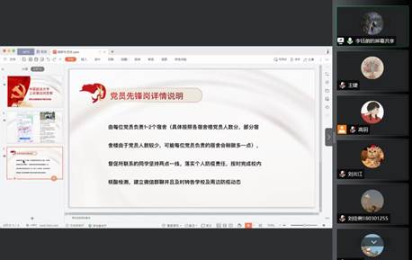接着,李钰朗同志提出身为党员的我们不仅要自己以身作则,也要充分发挥党员先锋模范作用,设立党员先锋岗是一个很好的为大家服务和密切联系群众的机会。本次党员先锋岗由每位党员负责联系1~2个宿舍,通过建群等方式及时传达学校及周边防疫动态,督促所联系的同学坚持“两点一线”,按时完成校内核酸检测,落实个人防疫责任。