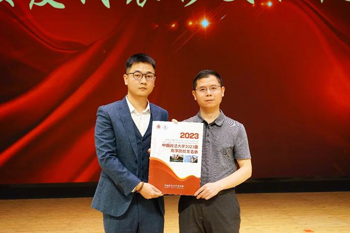 副院长刘志雄教授代表学院向校友代表移交校友名册,2013级金融工程专业毕业生刘欣源作为校友代表发言。刘欣源校友多年来深耕于人工智能领域,他分享了一路走来的成长蜕变并介绍了目前所在的人工智能独角兽企业的发展状况。他还对学院对自己的培养以及任命他为企业家创投俱乐部秘书长的信任表达了感谢,并勉励同学们要共同努力奋斗,实现个人理想并服务国家发展。