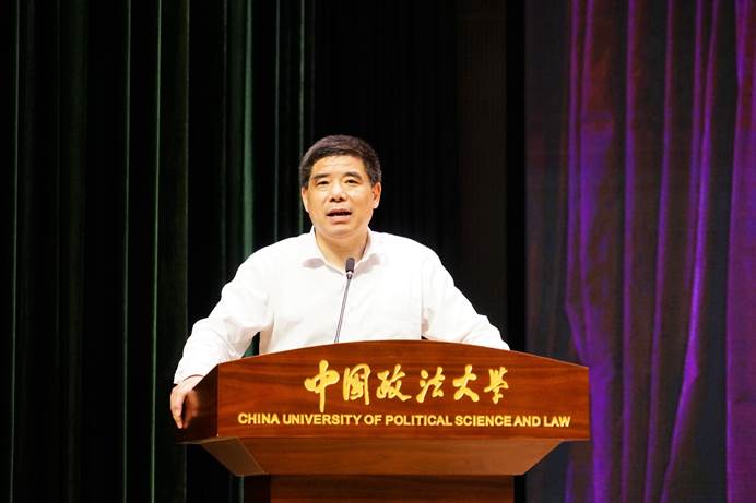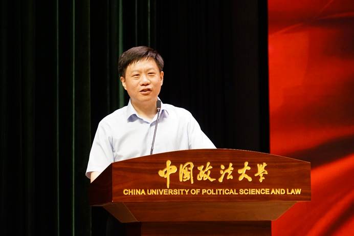 国际商务系戴建华教授作为教师代表讲话,戴建华教授以自身带领学生参与亚沙赛、亚草赛的经历,分享了“法大拓荒牛”跑团“凡我在处,皆是法大”的精神,对同学们未来的发展寄予殷切期盼。