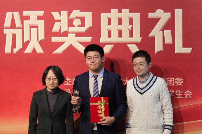 创新创业奖学金。获奖团队代表邵祺、吴婕颖、张晨曦、罗舟玚、朱锦、刘欣欣同学上台领奖,徐迅达老师、何欣老师共同为其颁奖。颁奖过后,来自北京本真至简科技有限公司的徐迅达老师讲话。徐迅达老师慷慨分享自己的创业经历,表示愿意与有创业想法的同学交流,鼓励同学们坚持梦想,敢于创业。