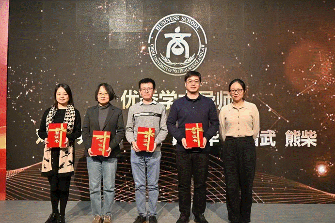 2023年优秀学术导师名单并为获奖老师颁奖。他们分别是邓晓老师、尹美群老师、姚璐老师、戴建华老师、洪智武老师和熊柴老师。熊柴老师作为优秀学术导师代表发表了获奖感言,鼓励同学们多与老师沟通交流。熊老师表示,不仅是学术导师,商院的每一位老师都会全力支持同学们。