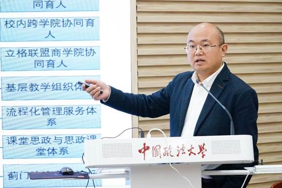 随后,郭颖教授进行工商管理国家一流本科专业建设点进展情况汇报。郭老师总结回顾了工商管理专业“开创法商融合的专业建设理念”、“突出法商复合型人才的全方位培养体系”、“满足法商管理实践需求的产学协同育人模式”三方面的特色优势,对当前重点课程、教材、教改项目、教学团队/名师、教学指导模式、教学成果奖等方面成果进行了具体介绍,并提出下一步建设的主要思路。