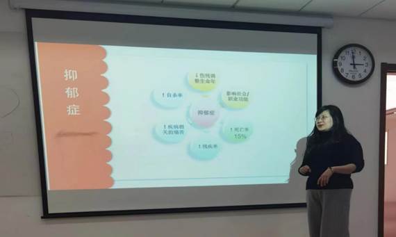 其次,许老师对学生在校期间比较典型的抑郁症进行了重点解说,从抑郁症的危害、典型表现,如何赋分确定轻度、中度、重度的分值,针对性的措施进行了讲解。许老师总结了抑郁症“三低”、“三无”、“三自”等特点,方便同学们学习和识别。