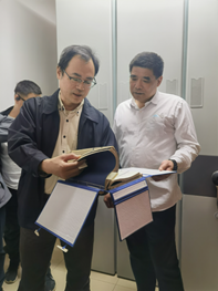 图二:所史展览馆馆长封越健为商文江一行介绍图书资料