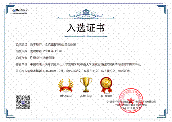 据统计,许恒副教授所撰写论文在知网上下载总量63805次,在《管理世界》、《教育研究》、《世界经济》、《中国工业经济》、Journal of Environmental Management、Journal of Economics Management & Strategy等国内外杂志上发表学术论文 40余篇,著有《平台经济市场竞争与反垄断研究》、《平台经济典型垄断行为分析与反垄断规制研究》等专著和教材。其中,作为第一作者在《管理世界》发表的学术论文《数字经济、技术溢出与动态竞合政策》被同时评定为高PCSI论文、高被引论文和高下载论文。