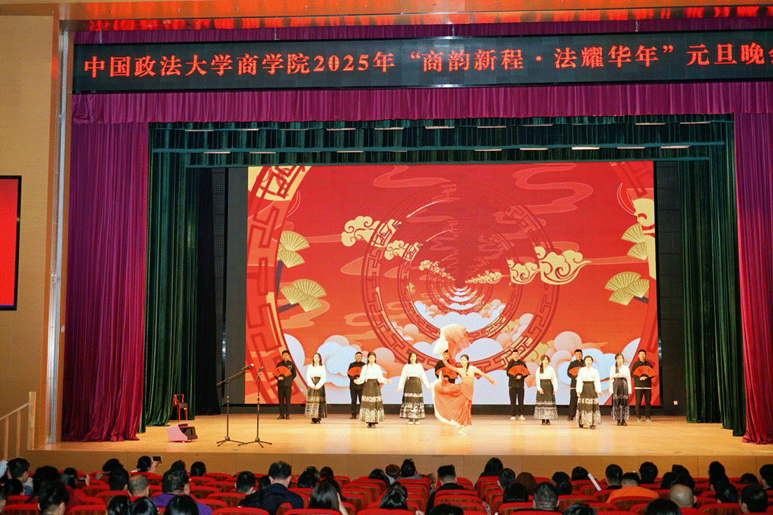 随后,师生们纷纷登上舞台,用才情与热情点燃了整个夜晚。院领导、老师们与学生代表共同合唱《灯火里的中国》,悠扬的歌声如潺潺溪流,诉说着对祖国的深情眷恋与美好祝福。2024级国际商务专硕的同学们用激昂的歌声演绎《不忘初心》,展现了法大学子对理想信念的执着坚守;活力四射的《Batter up》则彰显了学生们的青春朝气与蓬勃力量。张国栋同学与许恒老师的《法大人在北京》,如同一曲悠扬的京韵华章,唱出了法大人在京城的奋斗故事与深厚情怀。此外,朗诵节目声情并茂,昆曲《牡丹亭·寻梦》如梦似幻,仿佛带领观众穿越时空,领略传统文化的魅力;小品幽默诙谐,引得笑声与掌声此起彼伏;歌舞串烧活力四溢,展示了师生们的多才多艺与青春风采。晚会还精心设置了抽奖环节,丰厚的奖品如璀璨星辰,点燃了观众们的热情,将现场气氛推向一波又一波的高潮。