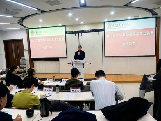 教学展示结束后进入点评环节。评委对参赛教师的表现进行了专业且深入的点评,对参赛教师的表现给予了高度评价。他们从教学内容、教学方法、教学组织等多个维度点评,肯定了教师们在课程设计、案例运用和与学生互动等方面的优点,同时也针对PPT内容、板书设计、课堂互动等提出了建设性意见。