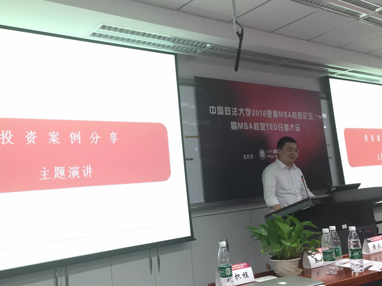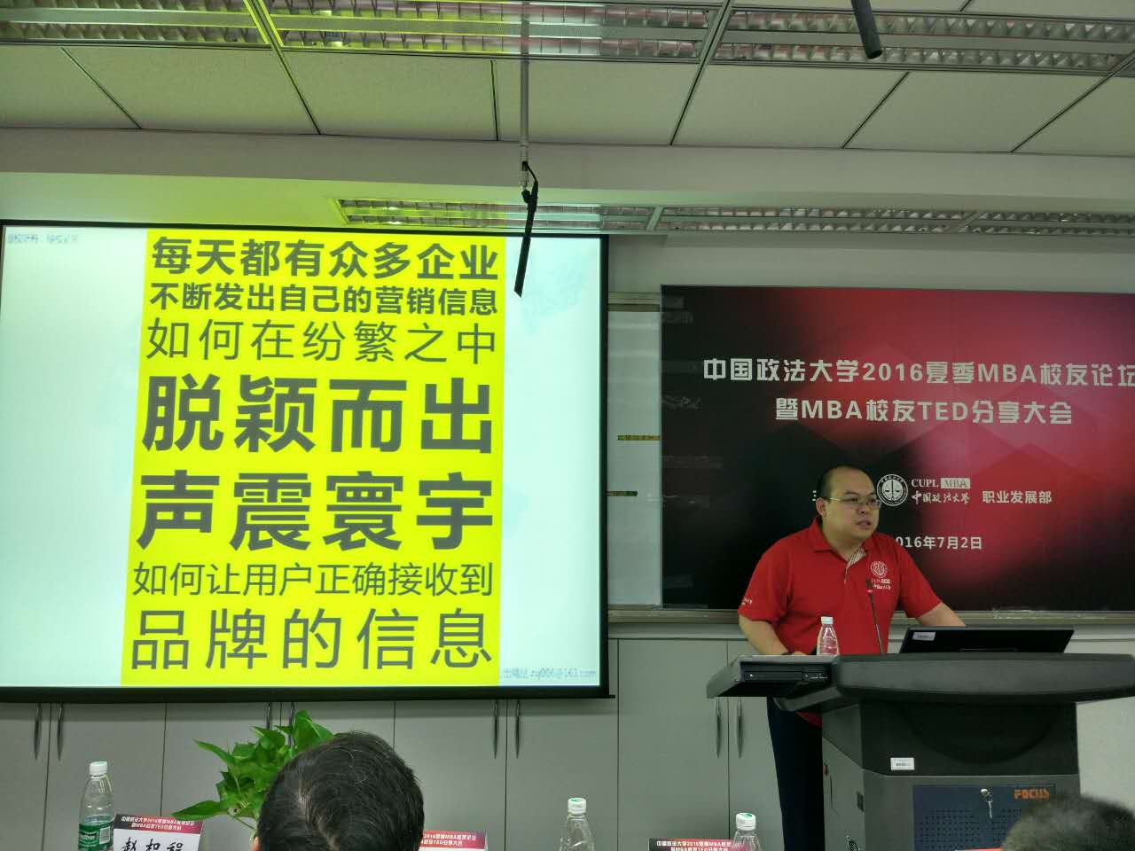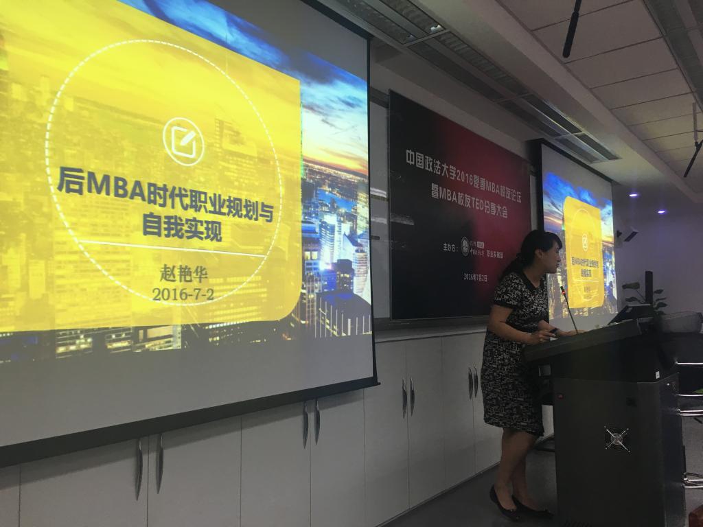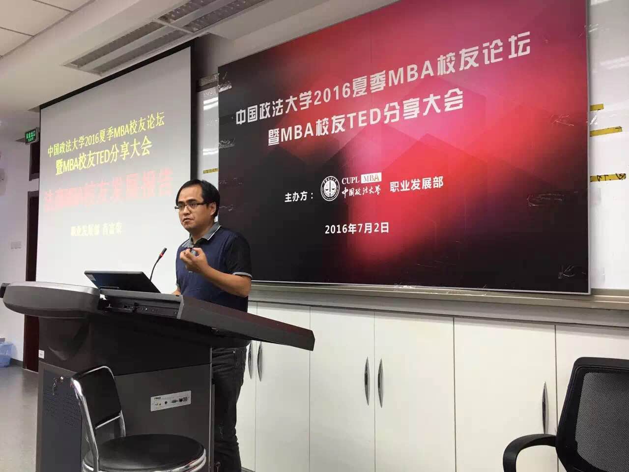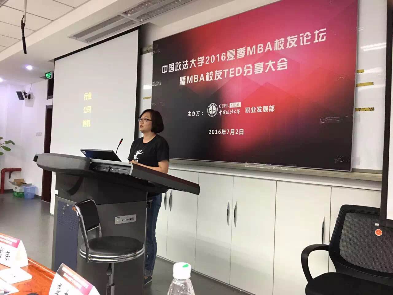 7月2日,中国政法大学2016夏季MBA校友论坛暨MBA校友TED分享大会在学院路校区科地102环阶教室举行,中国政法大学MBA教育中心副主任李景华老师,职业发展部部长肖富荣老师、主管陈秀杰老师以及8位来自不同行业和领域的MBA校友嘉宾参加了此次活动。此次论坛由中国政法大学MBA教育中心职业发展部陈秀杰老师主持。