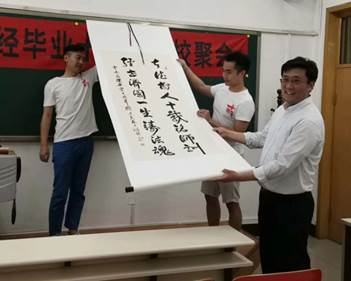 准备了一个饱含深情和谢意的礼物------精美的对联书法作品一幅。对联内容由校友同学们原创,特地邀请著名书法家徐培先生书写。对联写道:“立德树人十载铭师训,经世济国一世铸法魂”。院工会主席、经济系张毅来老师作为代表出席了下午的主题班会,并代表日本av
