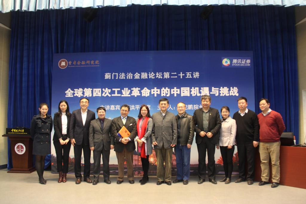 12月1日,在中国政法大学研究生院校区科研楼学术报告厅,蓟门法治金融论坛第二十五讲“全球第四次工业革命中的中国机遇与挑战”成功举办。本次论坛主讲嘉宾是汉德工业4.0促进基金主席,前德意志银行投行亚太区执行主席蔡洪平。本次论坛点评嘉宾分别是:中国证监会前副主席、中国政法大学兼职教授李小雪,中国政法大学副校长常保国,中国政法大学资本金融研究院兼职教授张捷。出席本次论坛的嘉宾有中国证监会发行处副处长于文涛、汉德资本首席运营官章素娟、互联网金融千人会秘书长易欢欢、第一财经《首席评论》制片人尹淑荣、投融中国联盟总裁马培瑞、三次方资本投资经理胡雅、中国南方电网公司驻北京办事处主任谭邵鹏、中国政法大学教授李晓、赖修桂、何俊萍等。