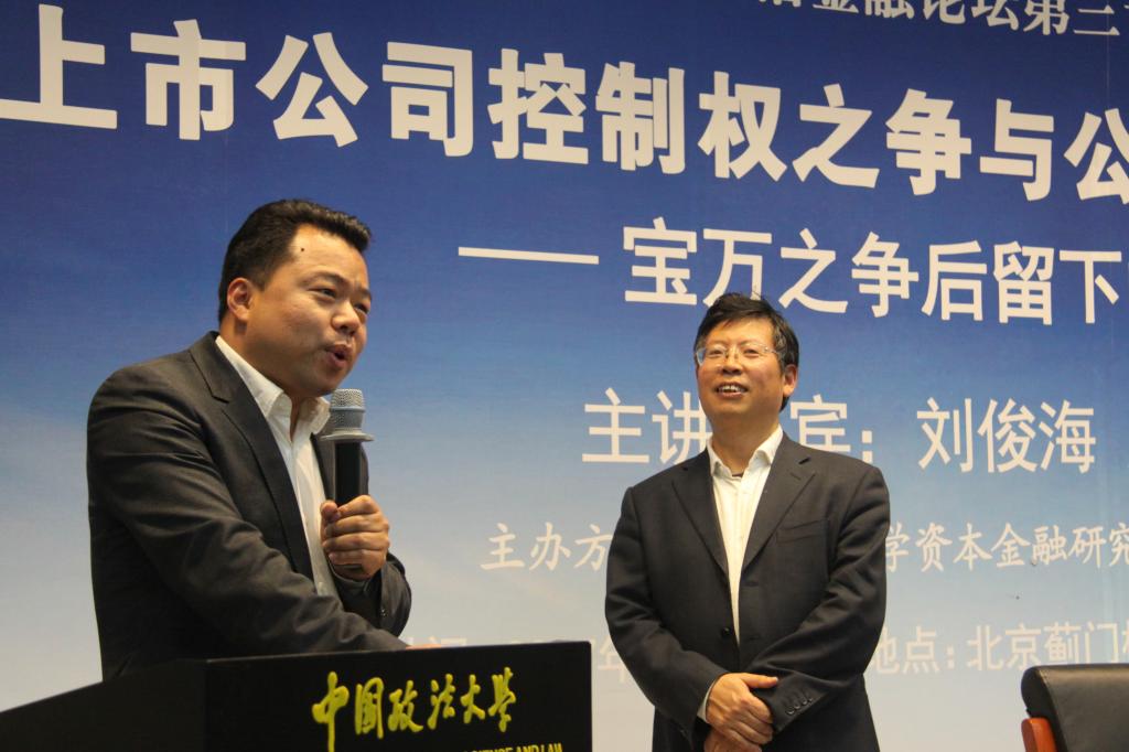 刘俊海以幽默的语言、流畅的思维、鲜活的案例渲染出严肃活泼的会场氛围,尽管会场因听众爆满而拥挤局促,但皆为思想所吸引而秩序井然。宝万之争持续引爆资本市场燃点,蓟门法治金融论坛紧贴资本市场前沿问题。以百家争鸣引真知灼见,为股东、企业家、监管者提供专业参考意见;为学生提供理论与实践相结合的经典分析;为研究者提供思想交流碰撞的舞台,这也是蓟门法治金融论坛举办的初衷!