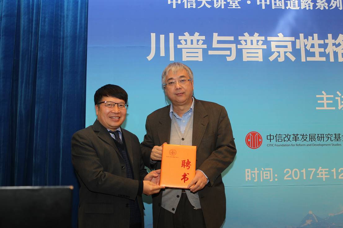 中国政法大学党委副书记、副校长常保国为本次论坛主讲嘉宾崔之元教授颁发中国政法大学兼职教授聘书。