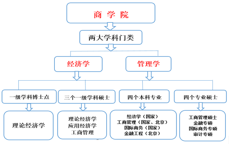 拥有理论经济学一级学科博士学位授权点,理论经济学、应用经济学和工商管理3个一级学科硕士学位授权点,以及工商管理、金融、国际商务和审计4个专业硕士点;3个国家一流本科专业(经济学、国际商务和工商管理),2个北京市一流本科专业(金融工程、工商管理),并与中国科学院大学合作开办成思危现代金融菁英班,联合培养金融工程专业人才。作为法学以外的三个学科之一,理论经济学列入中国政法大学新一轮“双一流”学科建设计划,与应用经济学和工商管理学科形成协同发展效应。
