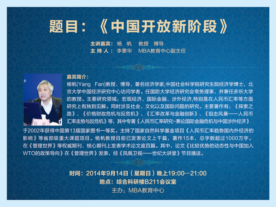 杨帆(Yang Fan)教授、博导,著名经济学家,中国社会科学院研究生院经济学博士,北京大学中国经济研究中心访问学者。任国防大学经济研究会常务理事,并兼任多所大学的教授。主要研究领域:宏观经济、国际金融、涉外经济,特别是在人民币汇率等方面研究上有独到见解。同时涉及社会、文化以及国际问题的研究。主要著作有:《探索之路》、《价格财政危机与反危机》、《汇率改革与金融创新》、《狙击风暴——人民币汇率走势与反危机》等,其中专著《人民币汇率研究-兼论国际金融危机与中国涉外经济》于2002年获得中国第13届国家图书一等奖。主持了国家自然科学基金项目《人民币汇率趋势国内外经济的影响》等省部级重大课题项目。杨帆教授目前已发表论文上千篇,著作15本,总字数超过1000万字。在《管理世界》等权威期刊、核心期刊上发表学术论文逾百篇。其中,论文《比较优势的动态性与中国加入WTO的政策导向》在《管理世界》发表,经《凤凰卫视——世纪大讲堂》节目播送。