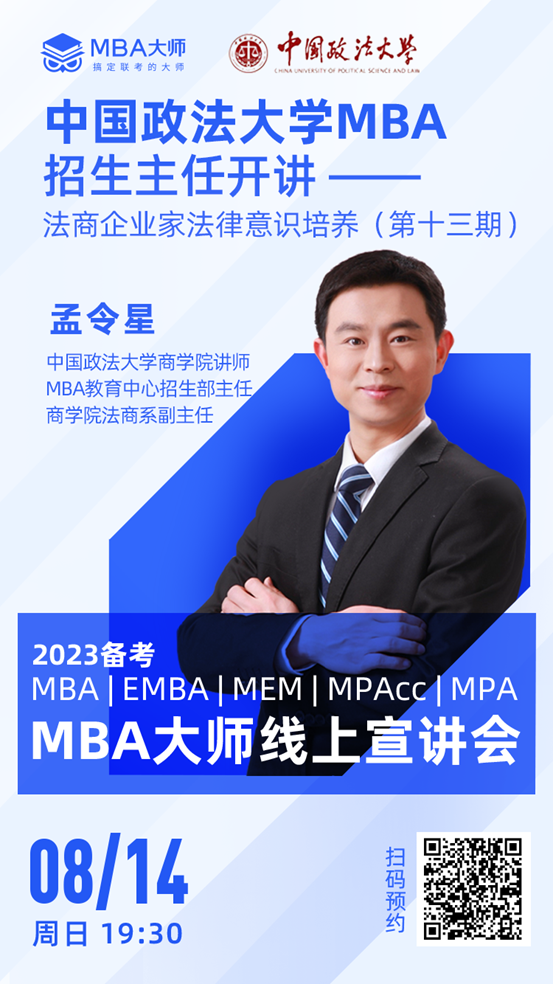 为了帮助大家在报考前就充分了解中国政法大学的MBA项目,做出最适合自己的选择,MBA大师邀请到中国政法大学MBA教育中心招生部主任 孟令星,从2022年5月22日起,进行共计13期的《招生主任开讲》系列公开课程。