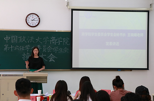 学生委员会学生会秘书长王晓曦老师发表讲话。她首先对到场的学生代表表示由衷的感谢,同时表示在学院进行重大改革之际,上一任学委会和学生会成员不仅尽职尽责地完成了本职工作,还助力于整个学院甚至学校的长远发展,其出色的大局意识以及服务意识值得传承。