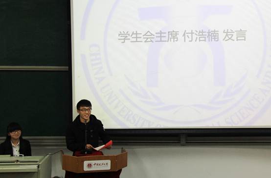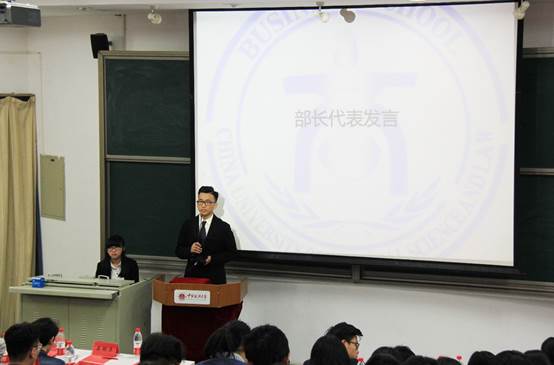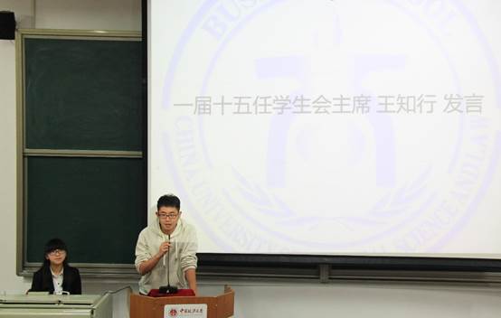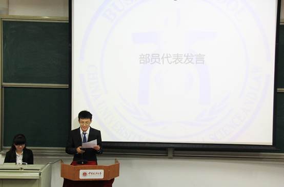 颁发仪式结束后,商学委审核部部长王鑫楚作为部长代表发言。他说部长要心怀感恩,勇担责任和敢于尝试,并号召大家要合理分配社团活动和学习的时间。
