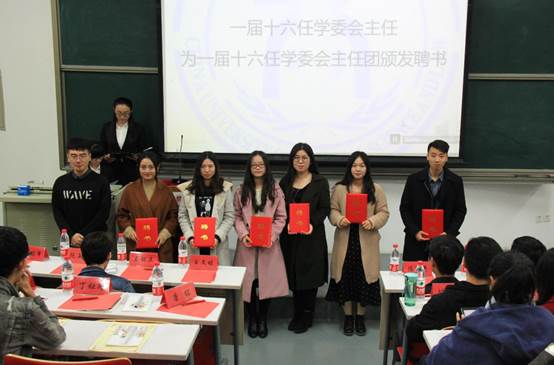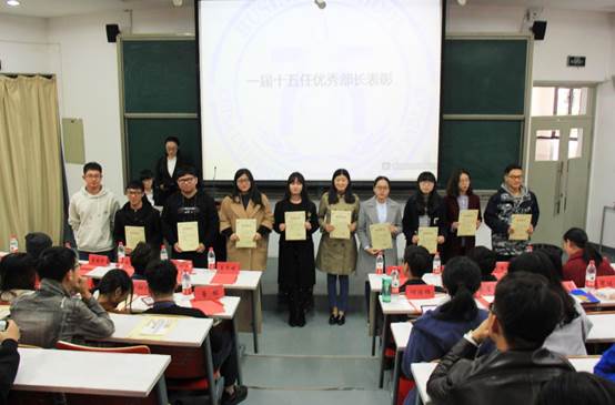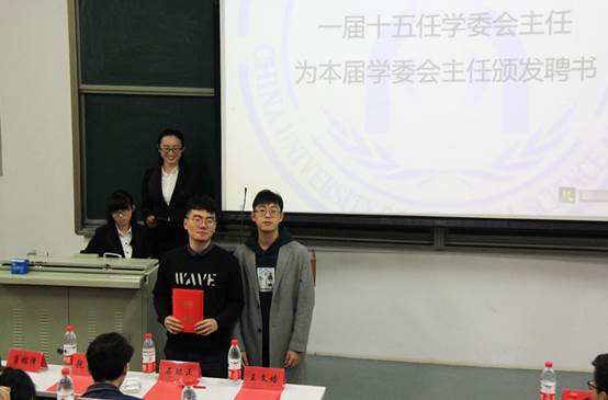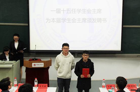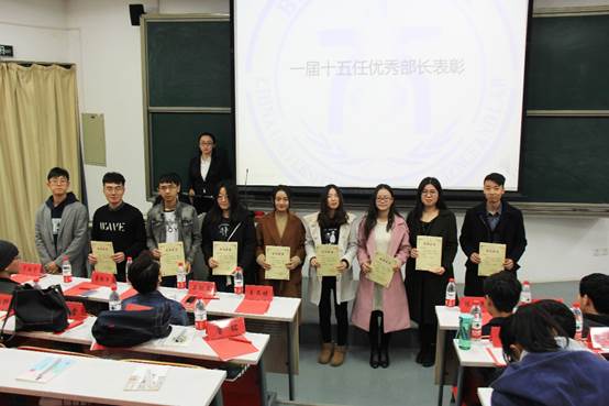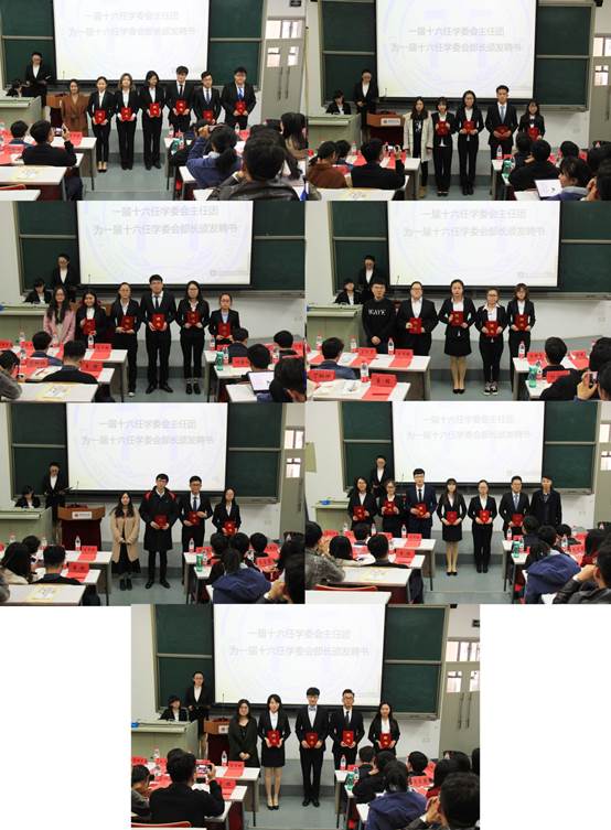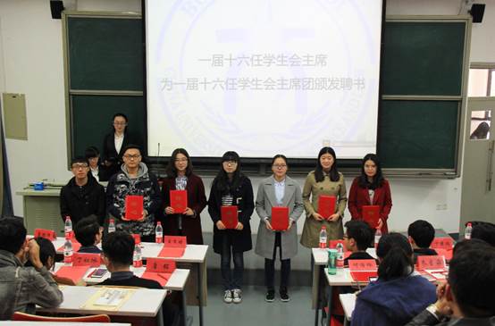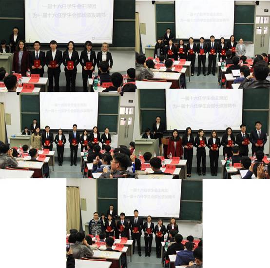 在热烈的掌声中,一届十五任学委会主任范翔宇和学生会主席王知行为优秀部长颁奖并合影留念。一届十五任学委会主任范翔宇和学生会主席王知行分别为一届十六任学委会主任唐铭和学生会主席付浩楠颁发聘书。随后,一届十六任学委会主任唐铭和学生会主席付浩楠分别为十六任学委会主任团和学生会主席团颁发聘书。各部门分管主席主任也分别为各部门部长颁发聘书并合影留念。