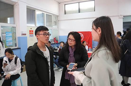 分团委书记兼2014级辅导员郭虹,分团委副书记兼2015级辅导员王晓曦来到献血地点看望献血的同学们。