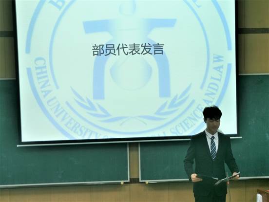 颁奖仪式结束,部长代表曾一凡发言,他代表部长表示对学委会学生会新干事的欢迎,并祝福大家能够在新的一年收获难忘的社团经历,学到有用的东西,努力提升自我。同时他表示,师兄师姐也一定会在新的一年带领大家共同进步、共同成长。
