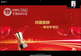 党委书记李欣宇教授为本次大会做闭幕致辞。李欣宇教授首先对上届MBA联合会作出的成绩表示认可,祝贺他们顺利圆满完成任务并光荣卸任,高度赞许今天参与竞选的演讲者们清晰美好的工作规划,并对汪鑫强同学当选本次MBA联合会主席表示祝贺。李书记表示,上一届MBA联合会在抗疫的特殊背景下、在受限制的条件下进行了具有创新性的工作,卓有成效,深受同学老师的热烈欢迎,令人印象深刻。李书记对新一任MBA联合会做出期许,提示世界上的事物都是美好的,一切前所未有的产品都是在有限的资源和受约束的情况下不断创新、创造出来的,每一件事都有它的限制和变数,MBA联合会工作要充分发挥自身创造性和主动性,服务同学、打响法大MBA品牌。最后,李书记预祝新一届MBA联合会工作顺利。
