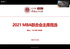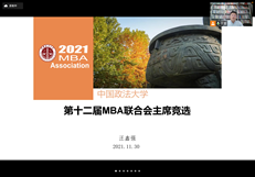 办学理念和MBA办学特色的强烈认同;同时阐述了自己如有幸当选,将为了更好的服务同学而做出一系列努力。对于法大MBA联合会接下来工作的展开以及相关学生活动的计划提出了自己的想法,以实现自己及团队更好地服务同学,服务MBA品牌的目标。