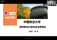 接下来,MBA学生工作部主任唱小溪老师代表中国政法大学MBA联合会第四次会员代表大会工作委员会,作出了大会筹备情况的说明。本次联代会从2021年11月初开始筹备,本着高效、有序、民主、公开的原则,积极稳妥地开展了下列工作:一、确定联代会代表名额;二、确认刘翔、付敏媛、汪鑫强、张鸿四位同学为此次联合会主席团竞选人;三、此次大会召开的时机是适宜的,条件是充足的。唱小溪老师希望新一届的联合会主席团能够秉承宗旨、努力开拓,使联合会工作迈向更高的台阶。