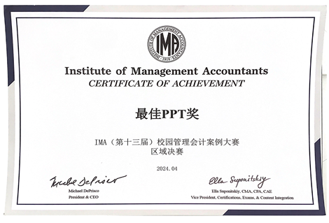 Figure 4 The "Metis" team won the certificate of merit for the best PPT award in the regional finals of the IMA Campus Management Accounting Case Competition