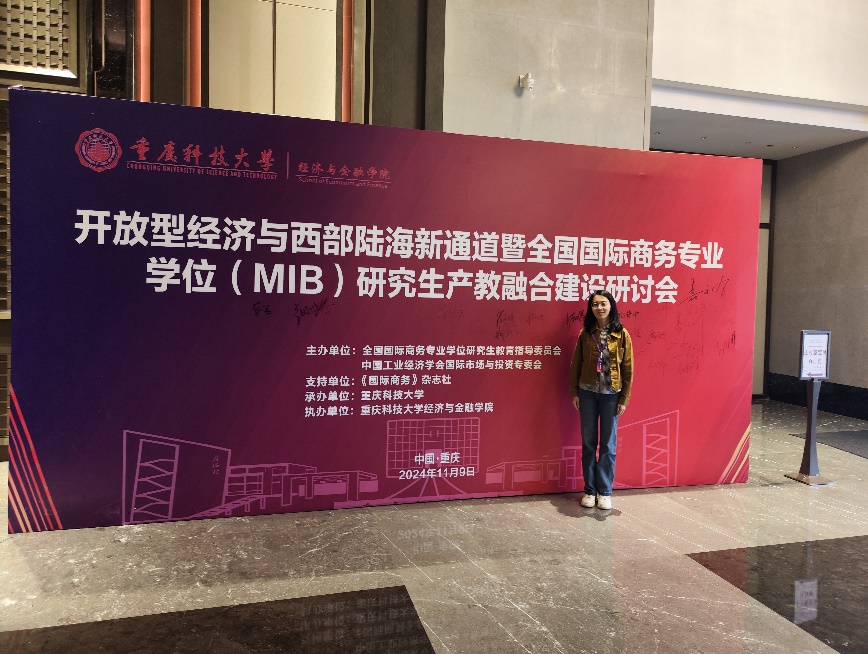 图1:张硕老师参加“开放型经济与西部陆海新通道暨国际商务专业学位研究生产教融合建设研讨会”