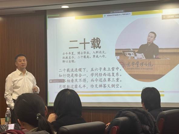 周长辉教授以他的个人经历为例,向师生们讲解了“四阶段理论”,这四个阶段分别是:不明就里、 机会主义、好奇心驱动与使命。周教授认为有三样基本功可以给养于学者,即Theory(理论)、Method(方法)和Technique(技术),基础扎实对于今后的学术生涯会持续发挥中流砥柱的作用。他将个人经历的体悟凝结成了一首首蕴含丰富文化气韵的诗,与同学们进行了分享。此外,作为管理案例研究专家的周长辉教授向师生们讲解了如何从小案例转向大案例。他以其所著的《以战略的名义》为例,向师生们讲解了大案例写作背后的观念转换和写作经验。大案例写作经验的分享让在场各位都受益匪浅。周长辉教授总结道:“大案例,关乎时代,关乎人生,关乎他者,关乎我者,关乎自己,关乎通透”,并以“自洽”为主题分享了一些人生感悟。