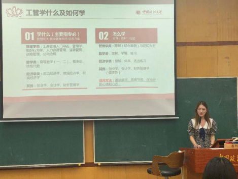 和工商管理专业进行了详细的介绍。同时指出,工商管理专业分为工商管理、法务会计、法商管理三个方向,是"国家级一流本科专业建设点"和"北京市一流本科专业建设点"。最后,郭颖老师对同学们未来的学习生活提出了几点建议。