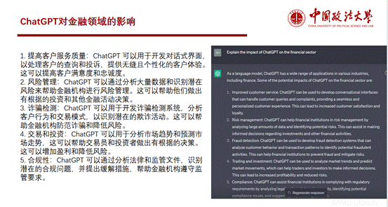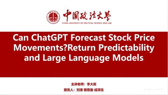 在文献内容阐述过程中,曾恩童同学介绍数据来源和研究方法。本文使用了证券价格研究中心(CRSP)的每日回报和Raven Pack的新闻标题两个主要数据集进行分析。使用包括在纽约证券交易所(NYSE)、美国证券交易商协会自动报价(NASDAQ)和美国证券交易所(AMEX)上市的所有股票代码为10或11的普通股为样本。使用在2021年10月份到2022年12月份之间的数据。使用RavenPack提供的“相关性分数”作为新闻与特定公司的相关程度的指标。在训练ChatGPT对股票回报进行预测时,作者要求ChatGPT扮演一个有股票推荐经验的金融专家的角色,评估给定的新闻标题及其对公司股票价格短期走势的潜在影响并输出评分,展示ChatGPT作为一种语言模型在金融分析任务中的能力。