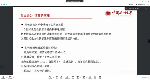 此次讲述主要分为三个部分。第一部分由林申琦同学介绍了情绪大脑和情商的本质,从生物学的角度解释情绪是如何产生的,以及阐述情商(也称为情绪智力)包含了解自身情绪、管理自身情绪、自我激励、认识他人情绪和处理人际关系;第二部分由张子潇同学介绍了情商在婚姻和工作中的应用,并提出维系婚姻关系和提升工作效率的方法;第三部分由林申琦同学讲解与情商相关的论文《领导情绪智力对员工组织认同、组织公民行为影响的跨层分析》。随后,主讲人与同学们激烈讨论了“为什么说情商比智商更重要”、“如何培养情商”等问题。