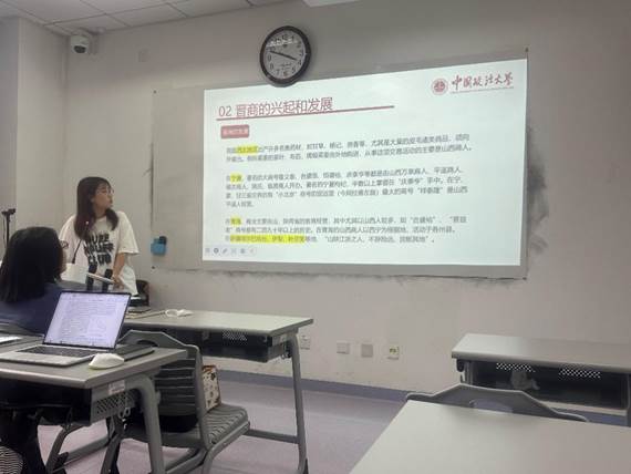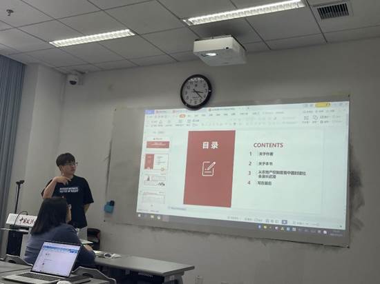 李丹同学以《浅谈中国古代土地及赋税制度演变》为题进行主报告,详细介绍了我国从西周至清朝的土地制度及相关赋税制度,并对当代的土地争议问题进行讨论。李丹同学认为,中唐两税法使土地自由买卖,古代社会从“国家—农民二元结构”转变为“国家—地主—农民三元结构”,这对国家动员能力等影响很大。在当代,随着新一代青年人脱离土地,土地无人耕种窘境逐渐凸显,急需一场变革来保障国家粮食安全。陈明生老师和熊柴老师在点评中谈到,李丹同学以中唐两税法为分界线划分古代社会结构的观点有待商榷,需要进一步论证。
