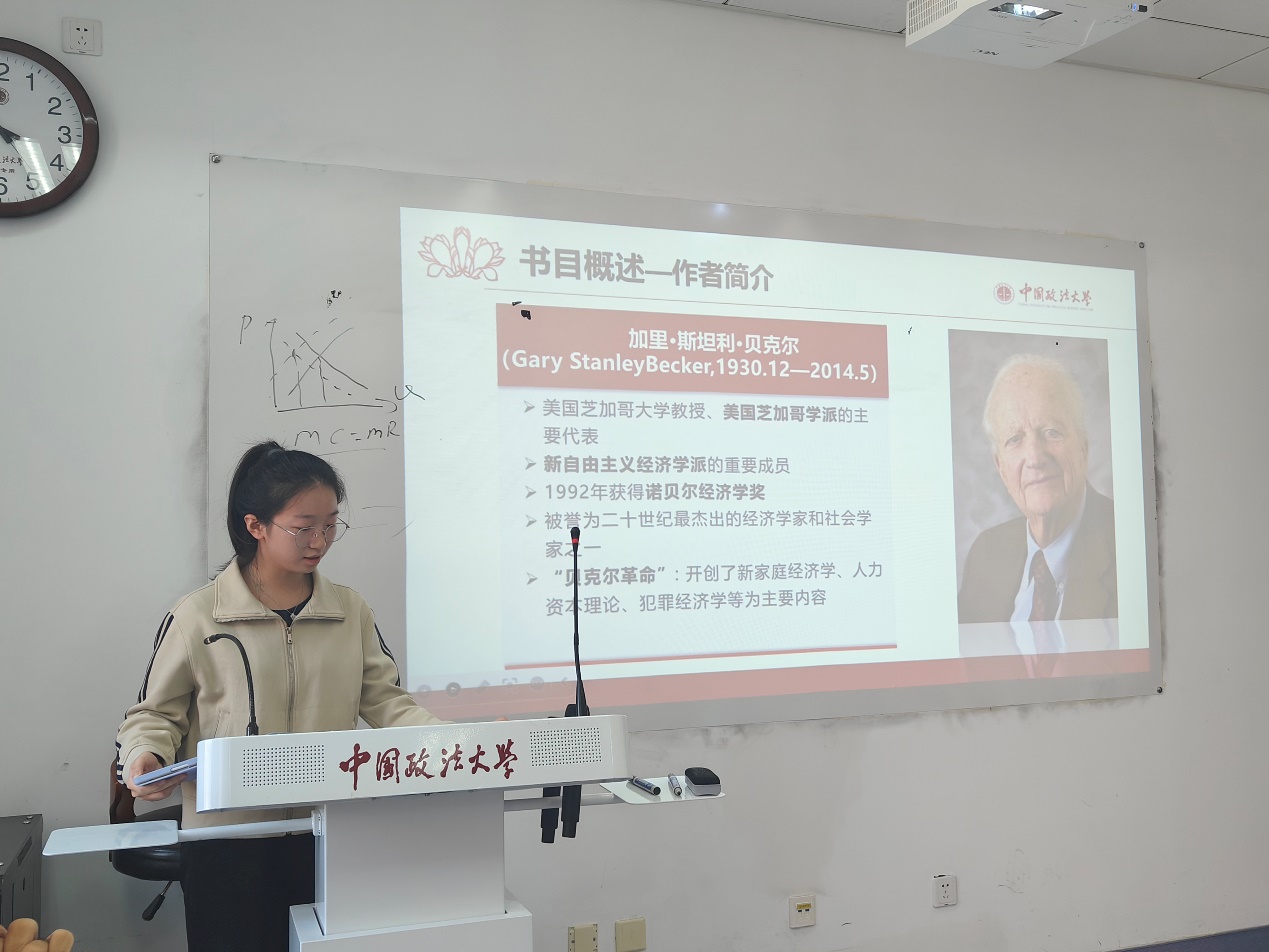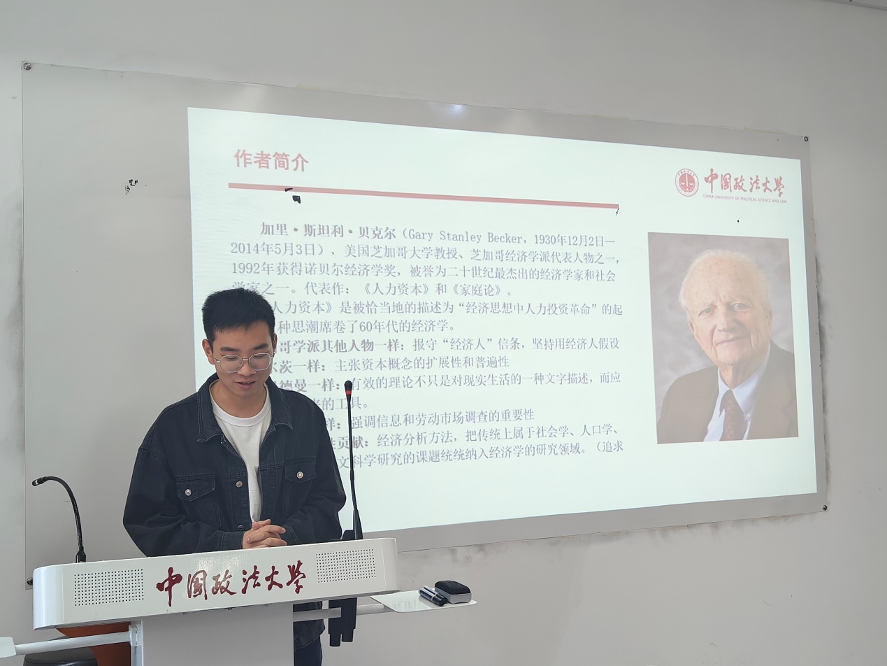 经济系、经济学党支部在学院路校区综合楼0607成功举办2023年第6期(总第49期)研究生读书会,阅读书目为诺贝尔经济学奖获得者加里·贝克尔的著作《人类行为的经济分析》。本次读书会由经济系周敏丹老师、司海平老师和赵文睿老师共同指导,熊柴老师推荐书目并主持。2022级和2023级政治经济学、西方经济学专业的同学们共同参加。2022级尹福、申晨笛同学以及2023级蔡雨颖、冀源同学做主报告。