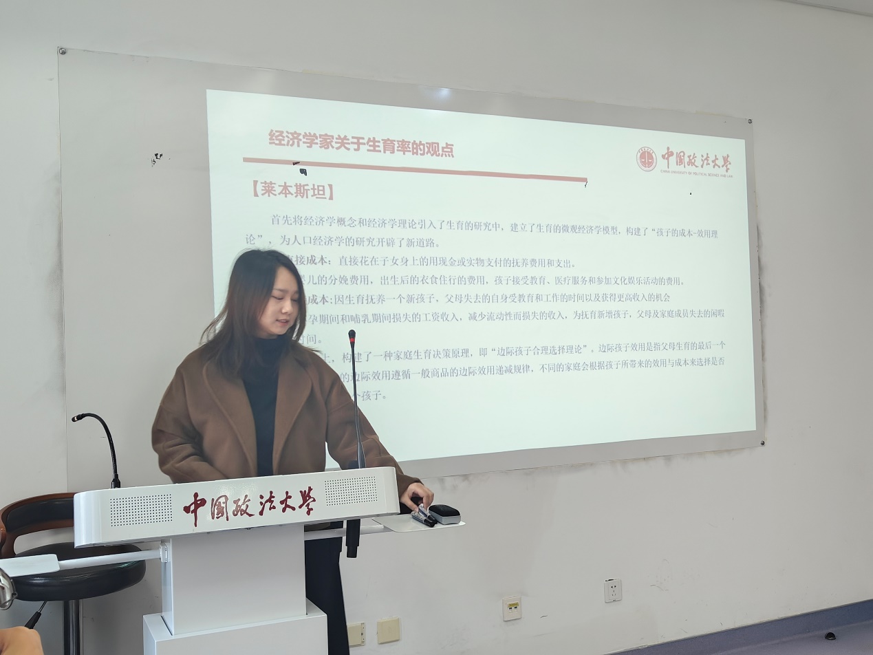 赵于均同学点评道,贝克尔的家庭生育理论继承了莱宾斯坦经济与非经济的成本收益综合衡量思想,在此基础上谈到了孩子的“质量”问题,生育子女的数量和性别这些附带的经济价值是生育决策的重要依据,而孩子抚养费用的成本高低则是影响决策的重要环节。熊柴老师指出,报告中引用的生育率数据不够准确,并针对成本部分讨论了房价对生育率的影响。周敏丹老师指出,研究时要区分实际生育率和生育意愿,要关注生育次序以及父母的代际利他主义程度。