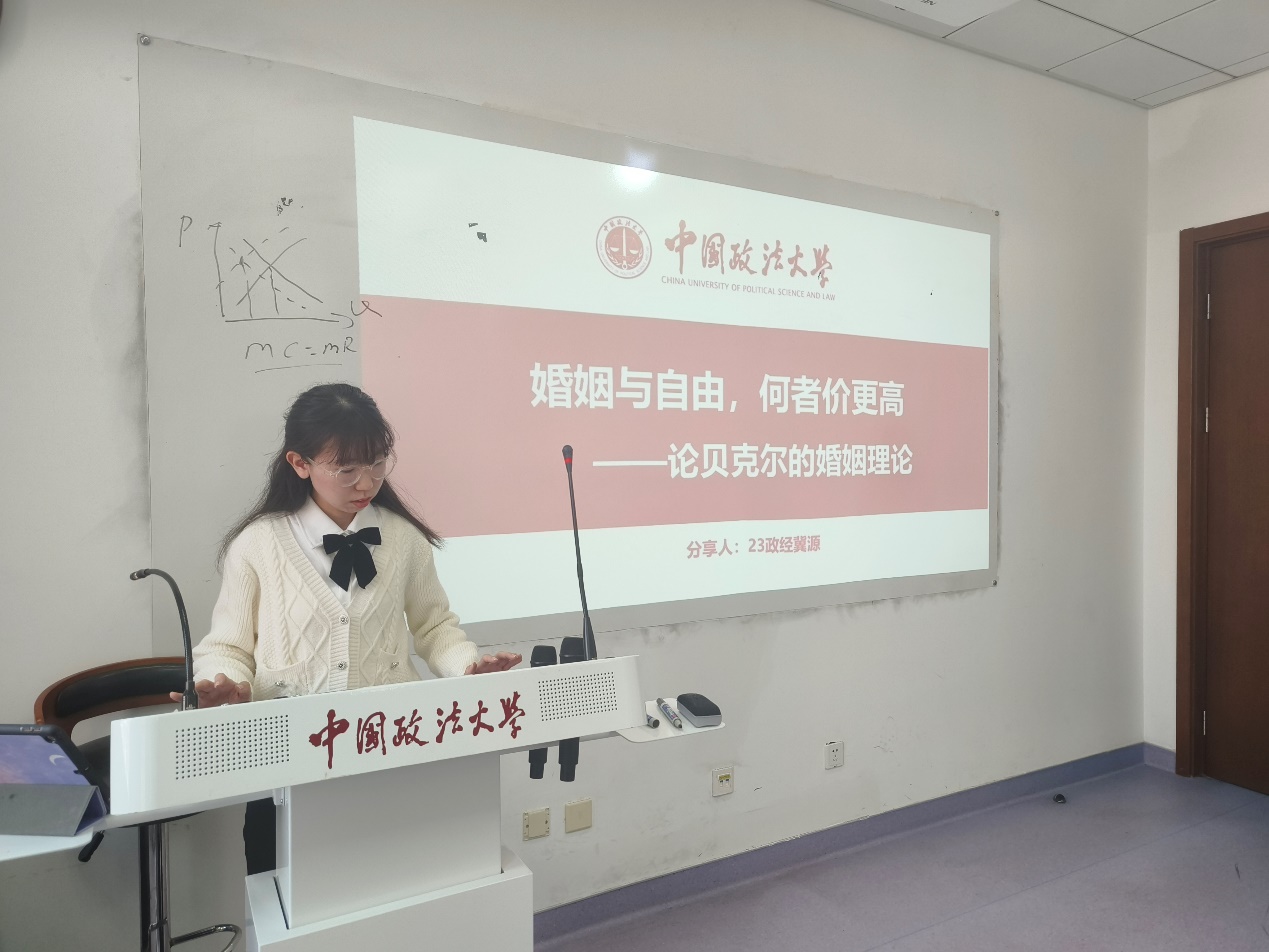李鹏举同学点评道,冀源同学的报告对贝克尔的婚姻理论做了较为全面的讲解,该理论符合经济学成本收益分析的理论框架,并且联系诺奖得主的著作进行了延伸拓展。熊柴老师谈到了婚姻配对问题、性别比失衡问题等,并对婚姻理论进行了进一步的扩充。赵文睿老师指出戈尔丁教授做了很多关于收入分配问题的研究,介绍了其著作《药物的力量:口服避孕药与女性的职业和婚姻决策》的主要观点,并谈到,很多学者在研究女性就业的时候,以女性劳动参与率提高为目标,但这并不意味着女性在就业市场的地位提高。