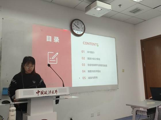 李鹏举同学从制度、适度集权与经济持续繁荣之间的关系作为切入点进行分享。他选取明清时期的中国、光荣革命后的英国和非洲索马里的事例进行分析,比较了过度集权、适度集权、缺乏集权的政治制度对经济发展的影响,并且引用比较其他学者的观点,总结评价了本书的意义和不足之处。