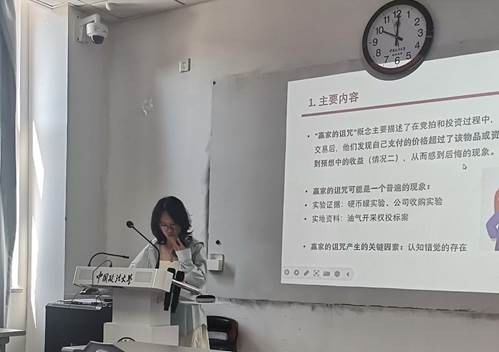 本次活动主要分为两个环节:书籍内容分享和问答讨论。读书会开始时,康淑玲同学首先介绍了本书的背景和作者理查德·塞勒的学术成就。塞勒是行为经济学和行为金融学领域的先驱之一,他在2017年获得了诺贝尔经济学奖,其主要研究领域包括行为经济学、行为金融学和决策心理学。接着,她详细介绍了书中的前六章内容,并详细分析了几个经典案例。她指出,书中提到的“赢家的诅咒”现象,不仅在拍卖中普遍存在,在现实商业决策中也经常出现。例如,在公司并购过程中,竞标成功的公司往往支付了过高的价格,导致实际收益未达到预期,甚至出现亏损。