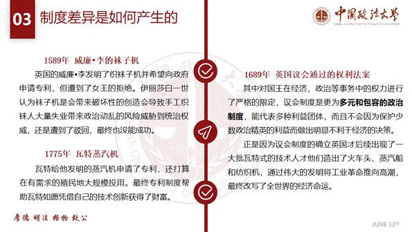 本次同学们的汇报内容主要分为三部分。第一部分是对本书基本内容的背景概述;第二部分是书中主要内容介绍,主要从制度决定国家贫富、制度差异如何产生、制度如何延续三个方面进行阐述;第三部分本书内容总结。