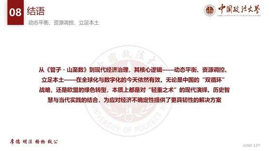 以《管子・山至数》思想为切入点,程碧波老师深入分析了我国在中美贸易战中的优势。他强调,《山至数》中蕴含的国家调控智慧、资源战略思维和动态平衡理念,为我国应对贸易争端提供了深厚的思想支撑。我国在贸易战中展现出的对关键领域的调控能力、对战略资源的有效管理,以及在开放与自主之间的精准平衡,正是古代经济思想在当代的生动实践。这种基于本土智慧的治理逻辑,使我国在复杂的国际经济环境中能够保持战略定力,从容应对挑战。