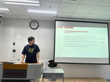 2023级政治经济学专业的李成宇同学以《天下大同:人口负增长时代下的共同富裕》为题进行了汇报。他指出当前中国面临着劳动年龄人口下降、“未富先老”以及城乡养老金差距大等问题,加剧了经济增长放缓、消费需求不足、区域发展不平衡等风险,提出通过经济转型与分配制度改革以应对挑战。具体来说,一是推动高质量发展,加快科技创新和全要素生产率提升,促进数字经济与实体经济融合;二是深化初次分配、再分配、三次分配改革,如消除城乡二元结构、完善社会保障、鼓励企业参与社会公益;三是建设中国式福利国家,以人口冲击为催化剂,遵循 “量力而行与尽力而为” 原则,利用 “瓦格纳加速期” 规律,通过公共财政可持续保障完善社会福利体系,目标实现 “低人口增长 - 高人力资本 - 强社会福利” 的均衡发展,在公平与效率统一中推动共同富裕。